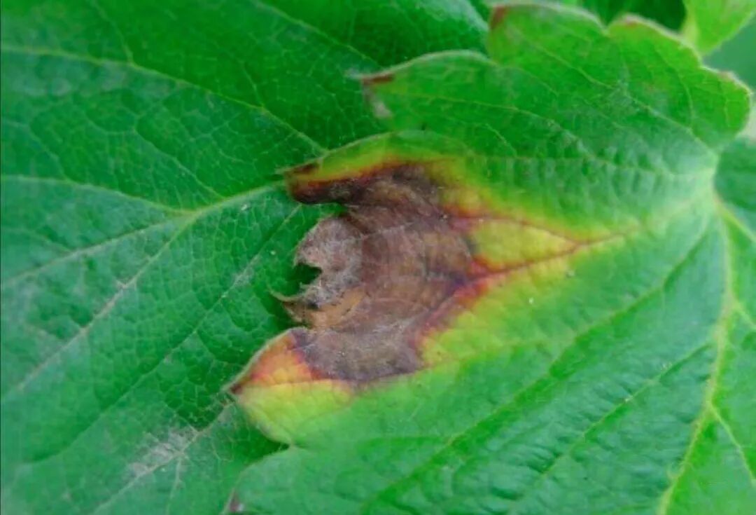灰霉病:初期在叶片上形成水渍状斑点,随后由叶缘向内呈“V”字形扩展。