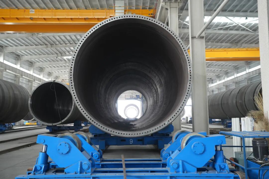 在1.2万平方米的风机塔筒生产车间内,7条生产线有序运转,涵盖切割、焊接、防腐至检测全流程。“此次下线的首套塔筒将发往青海省茫崖市,其壁厚达55毫米,最大直径5.35米,整体高度127米,总重460吨,将分五段运输,预计3天内抵达风场。”该公司副总经理张继鑫介绍道。