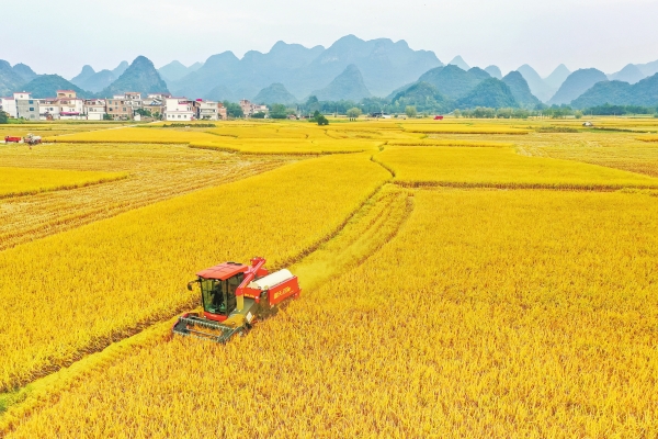 10月26日,湖南省永州市宁远县湾井镇下灌村,收割机在稻田里来回穿梭作业。金秋时节,该县19.3万亩晚稻进入集中收获期,当地通过“科技+服务”模式,助力秋粮丰产丰收。 来源/作者: 湖南日报 彭华 摄(湖南图片库)