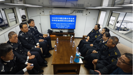 日前,辽宁省海洋与渔业行政执法总队水丰边境执法支队联合吉林省集安市农业综合行政执法大队、凉水朝鲜族乡人民政府、榆林镇人民政府在水丰水库吉林段开展联合执法行动。 行动前,省总队水丰边境执法支队积极履职尽责,聚焦中朝边境水丰水库跨省交界水域执法现状,在中国渔政21008执法船会议室,组织辽