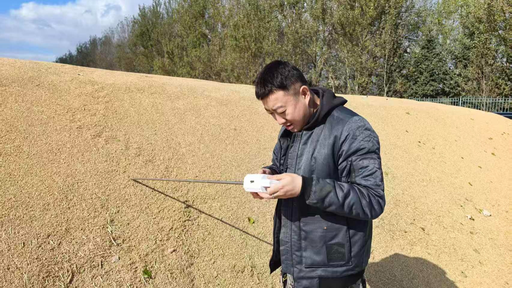 为确保广大种植户丰产的粮食能够安全存储、顺利销售,连日来,北大荒农业股份八五六分公司主动作为,组织农业技术人员深入晒场,为种植户开展粮食测水测温服务,实时掌握粮食存储状态,以实际行动筑牢粮食管护防线。 粮食测水测温(北大荒农业股份八五六分公司供图) 在各管理区晒场上,农业技术人员人员携带水分测定仪