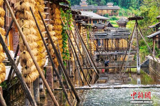 金秋时节,贵州省黔东南苗族侗族自治州从江县高增乡占里村,侗族同胞将丰收的糯稻谷晾晒在禾晾架上,禾晾与侗寨民居、小溪、青山相映成景,呈现出一道道亮丽的晒秋美景图。吴德军 摄 图为占里村的村民将糯稻谷挂到“晒秋”禾晾架上。吴德军 摄 图为占里村的村民将糯稻谷挂到“晒秋”禾晾架上。吴德军 摄 图