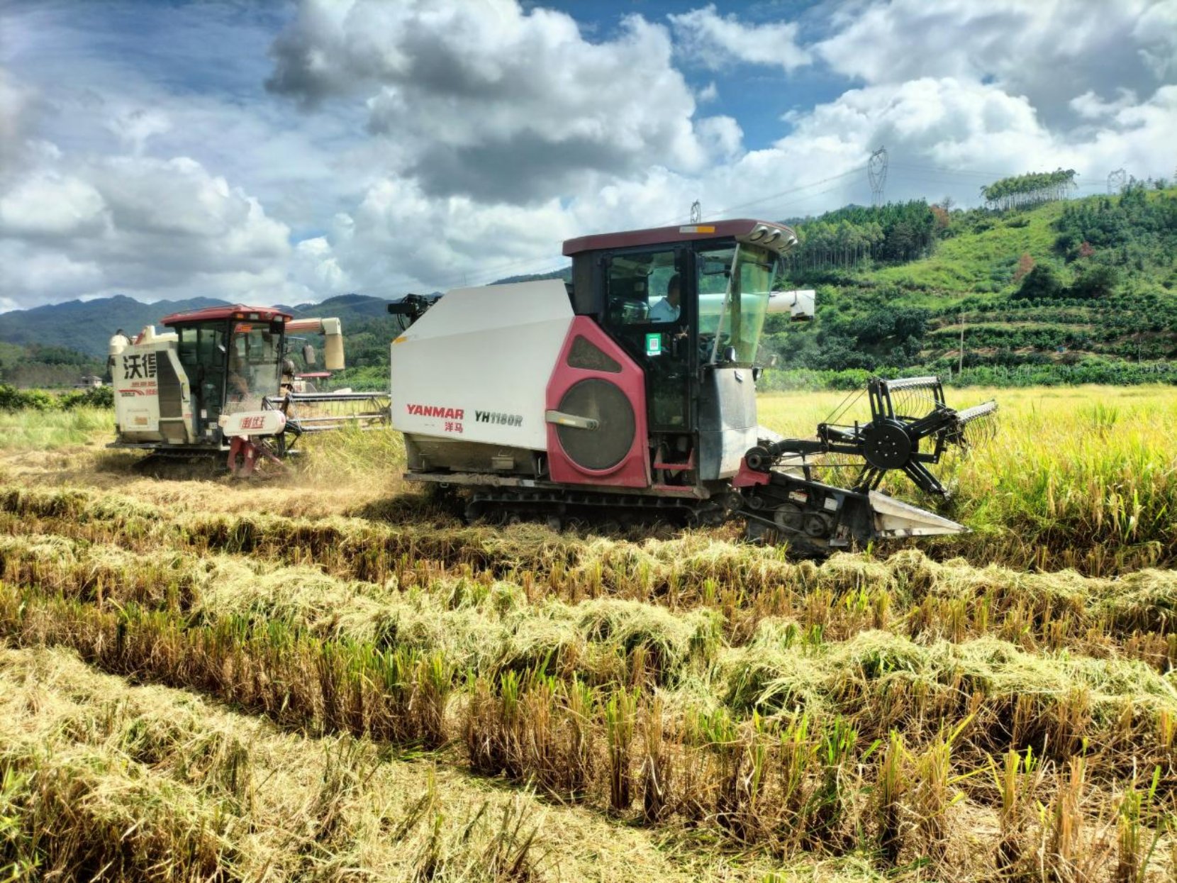 近日,桂林市恭城瑶族自治县2025年水稻机收减损技能大比武在龙虎乡拉开帷幕。4台不同品牌与型号的联合收割机整齐列队,农机手们驾驶机械穿梭于金黄稻田,收割、脱粒、秸秆粉碎等工序一气呵成。伴随机器轰鸣,稻谷尽数归入机身,只留规整稻茬;待收割机停靠地头,卸粮筒顺势伸出,饱满的金黄稻粒喷涌而出,稳稳落入运粮