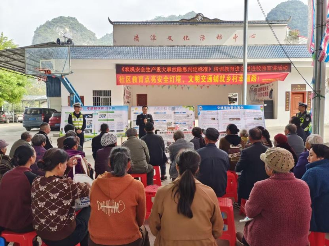 12月1日,在第十四个“全国交通安全日”来临之际,河池市宜州区农业农村局联合河池市公安局交通管理二大队,走进石别镇清潭村开展交通安全主题宣传活动,以“接地气”的宣讲和互动形式,为现场80余名学生及群众送上了一堂生动的农机安全知识“必修课”,切实筑牢乡村道路交通安全防线。 活动现场,宜州区农业农村局工
