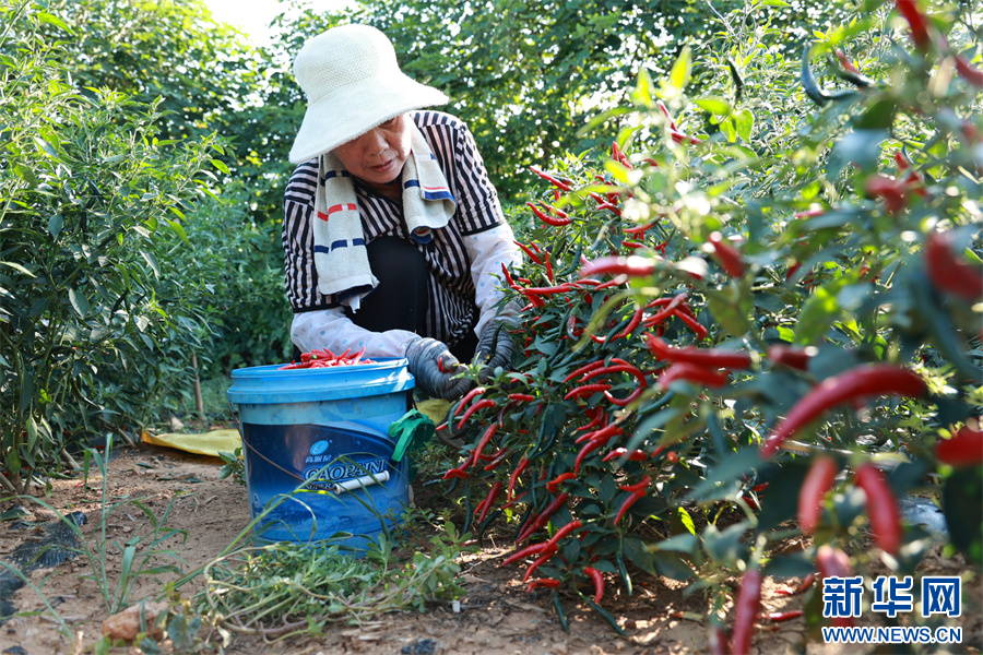 8月19日,河南省洛阳市孟津区小浪底镇南达宿村,村民正在采摘小米椒。 近年来,河南省洛阳市孟津区积极发动群众,将土地进行集约化管理,把进城务工、无劳动力农户的闲散耕地集体打包,整租给企业或种植户。当地围绕辣椒、葡萄、石榴等特色农产品,大力发展特色农业,通过规模化经营,发展连片种植,让村民在家