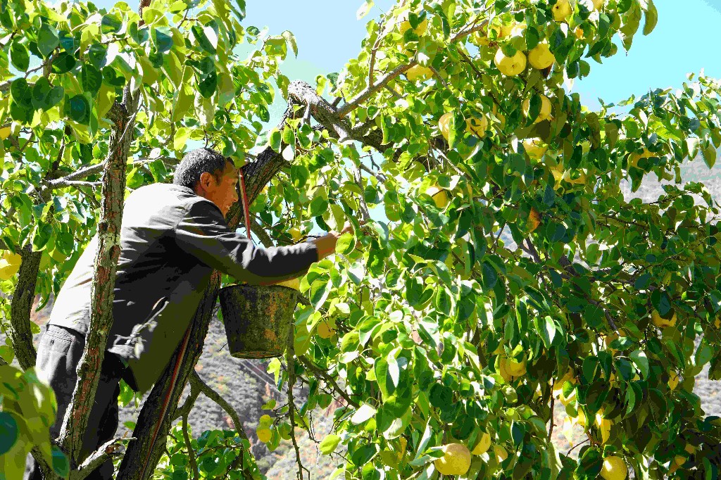 金秋时节,迪庆藏族自治州香格里拉市东旺乡跃进村丹珍曲批一家正穿梭在沉甸甸的藏梨枝头下,将金黄的藏梨小心翼翼地装入果筐。一家人脸上满是丰收的喜悦。“就盼着桑敦祝的收购车队来,这果子现在可是家里的‘增收功臣’!”丹珍曲批说。 东旺乡有藏梨树七千多棵,其中有很多是百年古树,藏梨品质好、营养丰富。