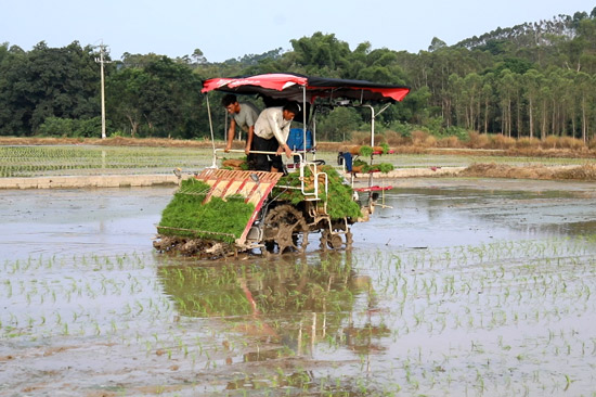 眼下正是水稻制种插秧的关键时节,博白县广大制种农户积极抢抓农时,依托智能化农机等现代科技手段,加快推进制种水稻插秧工作,让水稻生产跑出“加速度”,为制种水稻丰收和粮食安全打下基础。 村民利用插秧机开展水稻制种插秧作业 近日,在东平镇合江村400多亩水稻制种田里,水稻制种大户廖晓东首次组织机械开展水