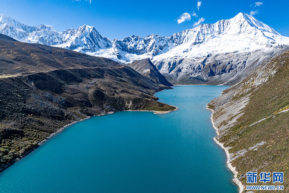 10月11日拍摄的库拉岗日-白玛林错景区(无人机照片)。新华网 旦增努布 摄 位于西藏山南市洛扎县境内的库拉岗日雪山巍峨壮丽,与白玛林错交相辉映,呈现出独特的雪山湖泊美景。库拉岗日雪山海拔7538米,屹立在喜马拉雅山脉中段的主脊线上,整个雪山由三座高峰组成。白玛林错湖面海拔4500米。 &a