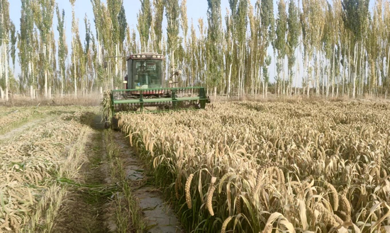 10月28日,在库车市玉奇吾斯塘乡杭甫巴格村,1200亩小米迎来丰收季。放眼望去,广袤田野披上金色外衣,成片的谷穗低垂,在阳光照耀下熠熠生辉。微风掠过,稻浪起伏,仿佛大地铺展的金色绸缎,处处洋溢着丰收的喜悦。 田间地头,一台绿色的联合收割机正开足马力,穿梭于谷浪之间。伴随着阵阵轰鸣,割台高
