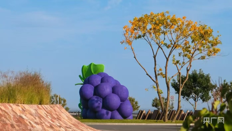 贺兰山脚下的“葡萄童话”景观(央广网发 杨佳 摄) 央广网银川10月17日消息(记者李畅 实习记者杨佳)晴朗的贺兰山脚下,一座巨型紫色葡萄雕塑傲然伫立,黄绿交织的树木与澄澈蓝天相映成趣,画面如漫画般清新梦幻,为这片土地平添了一抹独特的雅致韵味。 来源:央广网