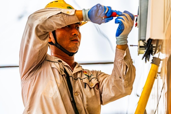 电力工人安装动力电表。 电力工人为电表接线。 汗水打湿了电力工人的工作服。 8月8日,在重庆市永川区大安街道官禄岩村的葡萄园里,一串串饱满的紫色果实垂挂枝头。种植户吴会华站在新架设的滴灌设备旁,看着国网重庆永川供电公司大安供电所员工陈林和同事们完成最后一道装表接线工序,脸上舒展开笑容:“我家