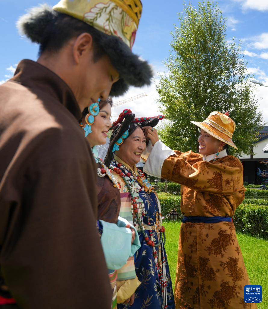 班珠丹塔(右一)在为模特调整藏装配饰(9月9日摄)。新华社记者 晋美多吉 摄 “00后”藏装设计师班珠丹塔,以创新诠释传统之美。这位四川大学文物与博物馆专业硕士,自幼深受藏戏、唐卡等传统艺术的熏陶,他从壁画、唐卡汲取配色灵感,运用现代面料重塑藏式美学,让藏族服饰兼具古典神韵与当代时尚。其设计
