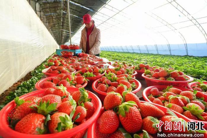 中新网河北新闻12月4日电 (韩晓欧 娄雅坤)初冬时节,河北省辛集市张古庄镇种植的草莓在绿叶的掩映下好似“红宝石”,饱满诱人。果农们忙着采摘、装筐,准备将草莓供应各大市场,抢“鲜”上市。 准备供应市场的头茬草莓。 娄雅坤 摄 果农采摘草莓。 娄雅坤 摄 果农采摘草莓