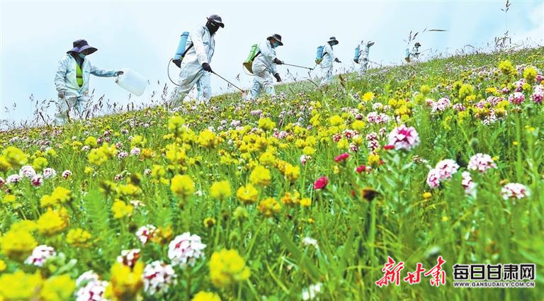 连日来,在肃南县皇城镇石佛崖林草湿荒一体化保护修复工程现场,林草专业技术人员与牧民合作,进行狼毒花和蝗虫清除治理工作。新甘肃·甘肃日报通讯员 王将 来源:每日甘肃网-甘肃日报